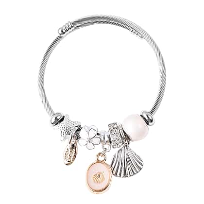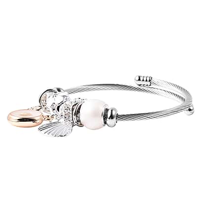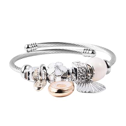 Simulated White Bead and White Austrian Crystal Enamelled Adjustable Charm Bracelet (Size 6-7) in Silver Tone