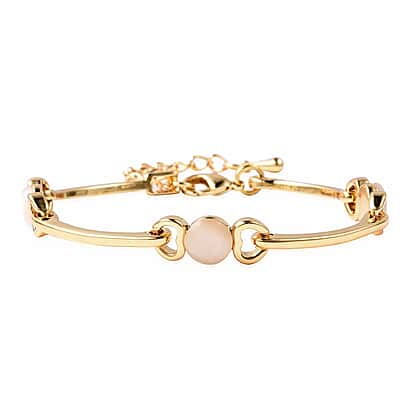 Simulated White Cats Eye Heart Link Bracelet (Size 7-8) in Yellow Gold Tone