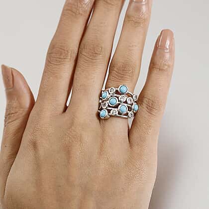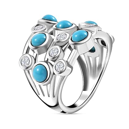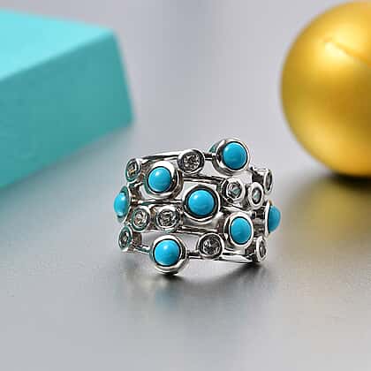 Sleeping Beauty Turquoise and White Zircon Bubble Ring in Rhodium Overlay Sterling Silver 2.69 Cts.