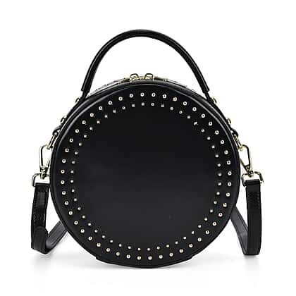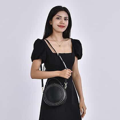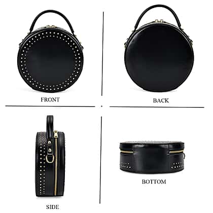 Genuine Leather Stylish Studded Circle Purse With Top Handle & Adjustable Strap - Black
