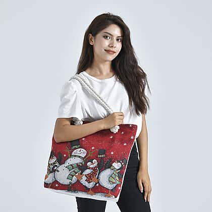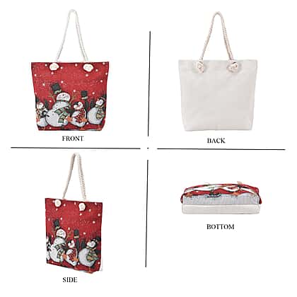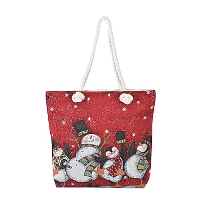 Snowman & Penguin Pattern Jute Tote Bag With Zipped Pockets & Handle Drop - Red & White