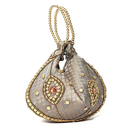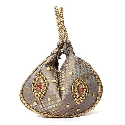 Turn heads with this silver potli bag that blends festive sparkle with classic charm. Embellished with hand embroidery and gleaming details, it’s designed to make a statement. The practical size (22x15 cm) offers space for your must-haves, while the double-handle design keeps it easy to carry. A secure zipper plus magnetic closure makes it ideal for events, parties, or evening dos. Whether you're dressing for a wedding or adding glam to a simple outfit, this accessory does the job beautifully. It’s a perfect mix of functional design and artisan style, handcrafted to impress.