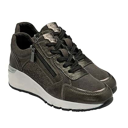 Step into comfort and style with the Lotus Solace gunmetal leather wedge trainers. Designed for all-day wear, these trainers feature a sleek gunmetal leather upper with subtle metallic highlights and a mottled side panel for a modern touch. The lace-up fastening with an exposed side zip ensures a secure fit while adding to the design. Resting on a lightweight 4.5cm wedge heel, they provide a slight lift without compromising on comfort. The shock-absorbing cushioned insock and padded ankle collar offer excellent support, making them ideal for daily wear. Whether running errands or meeting friends, these trainers keep you moving in style.