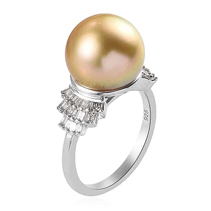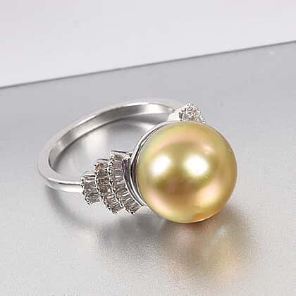 10.33 Ct. Golden South Sea Pearl and Diamond Ring in Platinum Plated Sterling Silver