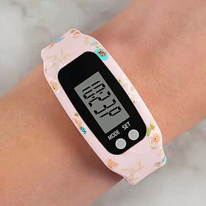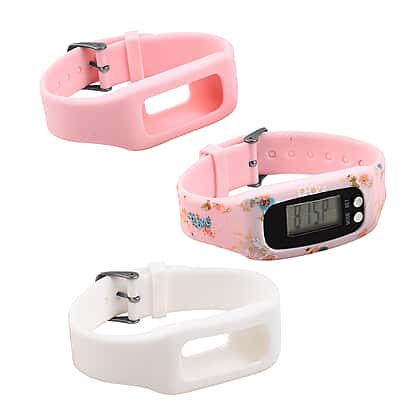 - Interchangeable straps are in white, pink and floral pink colours.