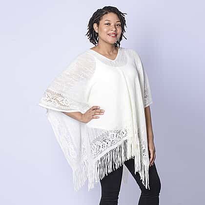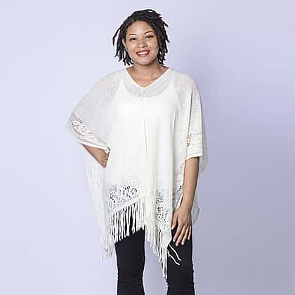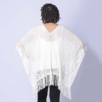 Spring Collection - Solid Cream Colour Hollow Out Poncho with Tassel (Free Size; Length 60Cm)