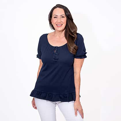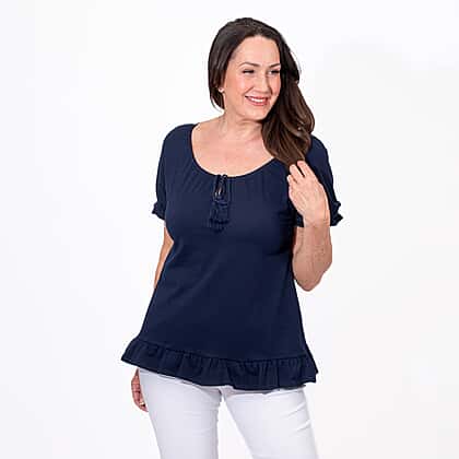Discover the charm of the MAISON Gypsey top, a delightful blend of comfort and style. Crafted from pure cotton, this top features a scoop neckline adorned with a playful drawstring and tassel, adding a touch of whimsy. The flounce hemline creates a flattering silhouette, perfect for any casual outing.