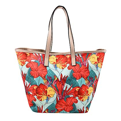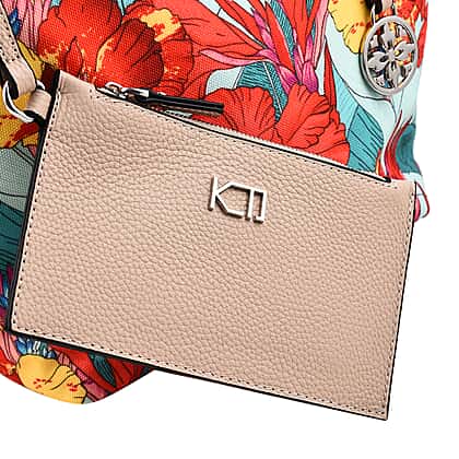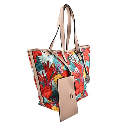 KTD by Kenzo Takada Leather and Cotton Canvas Floral Printed Tote Bag with Wristlet - Red and Blue
