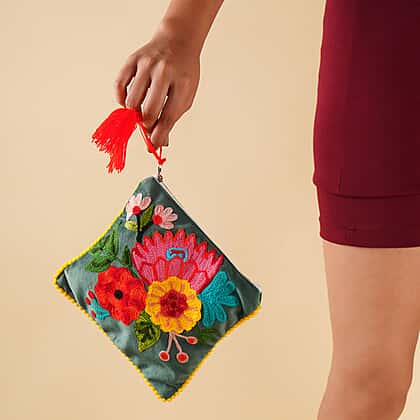 Suede Fabric Zipper Pouch with Colourful Thread Work - Green
