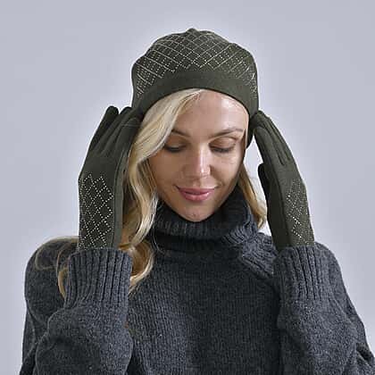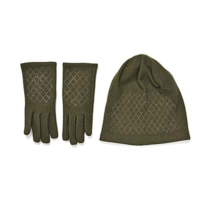 Stay cosy and stylish with this olive green Hat and Glove Set, perfect for chilly days. Crafted from a luxurious blend of 70% cashmere and 30% polyester, the hat and gloves provide exceptional warmth and softness while ensuring durability. The sleek design features elegant diamond-shaped accents for a modern touch. The gloves are lined for extra comfort and a snug fit, making them ideal for outdoor errands or household tasks during colder months. Lightweight yet insulating, this set is a must-have accessory for blending functionality with refined style.