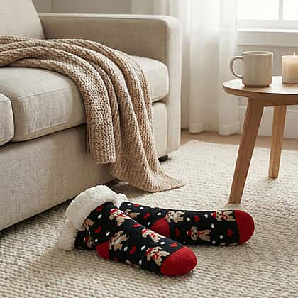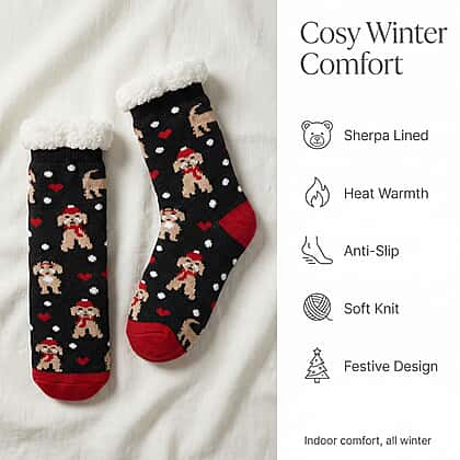 Wrap your feet in cosy comfort with these sherpa lined anti-slip slipper socks, designed to bring a touch of festive charm to your everyday lounging. Featuring adorable dog motifs and a soft fur lining, they keep you warm from morning to night. The durable acrylic outer and plush polyester interior make them ideal for relaxed days at home, while the slip-resistant soles add peace of mind on smooth floors. Perfect as a seasonal treat or thoughtful gift, they pair snugness with playful style, making chilly evenings feel wonderfully inviting. A lovely choice for winter comfort and joyful moments at home.