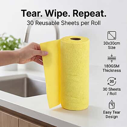 The Tear Away Microfiber Roll is a versatile, ultra-absorbent cleaning essential designed for home, office, and car use. Each roll contains 30 reusable microfiber cloths, measuring 30 x 30 cm, with a durable 180GSM thickness for superior cleaning performance.