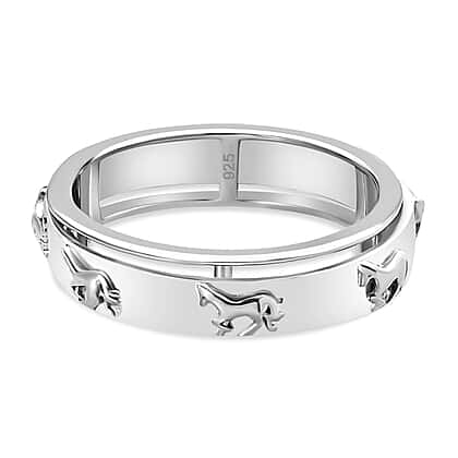 Show your love for horses with this sterling silver horse spinner band ring. This ring features a spinning band with four cut-out horses that move around the ring. The ring is made of sterling silver. The spinner ring is also known as the anxiety ring. The ring has a smooth and shiny finish that enhances its beauty.