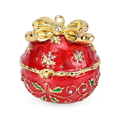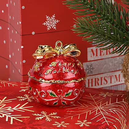 Christmas Ball Trinket Storage Box with Hand Painted Colorful Enamel & Jeweled with Sparkling Crystals - Red