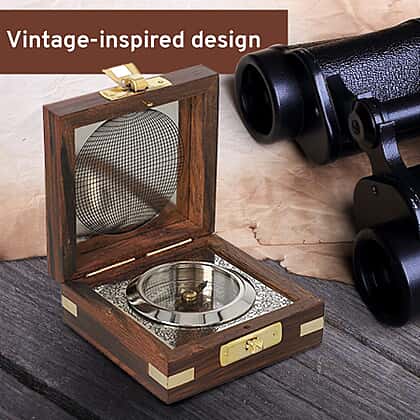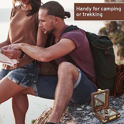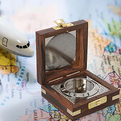 Handcrafted Wooden Box With Built in Goldentone Compass (Size 7.6x7.6x3.8 Cm) - Brown