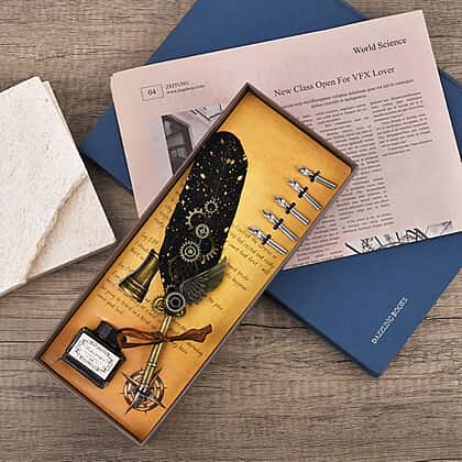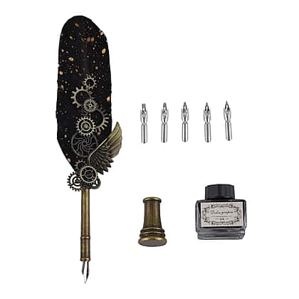 Vintage Carving Feather Pen Gift Box - Navy, Black & Gold
