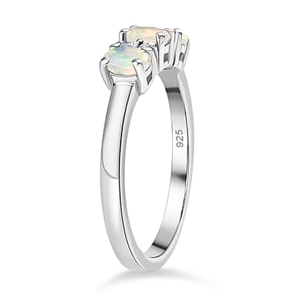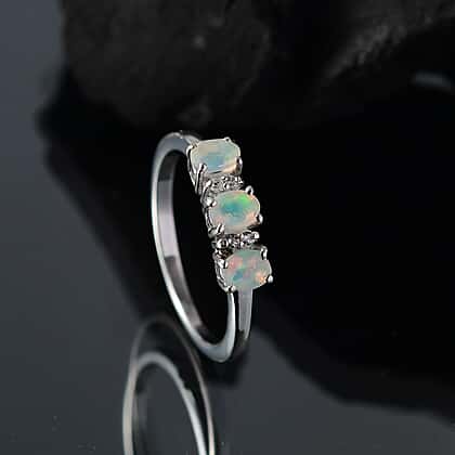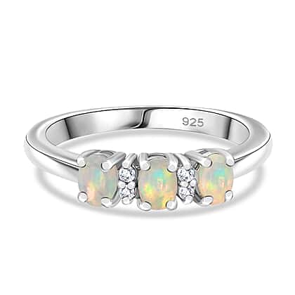 Ethiopian Opal & White Zircon 3 Stone Ring in Platinum Overlay Sterling Silver
