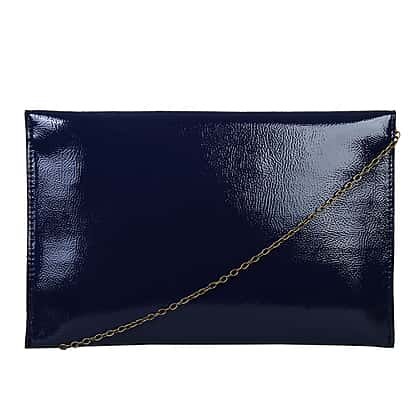 Isabella's navy envelop clutch bag is a large clutch bag that can contain a variety of stuff for a night out. This clutch bag includes an extra metal chain that may be draped over the shoulder. The bag features one zip pocket and one main section. This clutch bag closes with a flap. The hardware colour is called 'antique brush,' and it resembles polished gold in appearance.