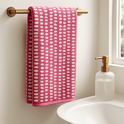 Add a gentle touch of elegance to your bathroom with the Copenhagen Home 100% cotton woven abstract dot pattern jacquard hand towel in pink. Made from luxurious 550gsm cotton, this towel offers both softness and durability for everyday comfort. Its jacquard weave creates a beautifully textured surface that feels indulgent against the skin while drying quickly and efficiently. The subtle pink hue and modern dotted design bring a refreshing yet calming look to your space. Measuring 90x50cm, it’s an ideal choice for daily hand use or as a chic guest towel.
