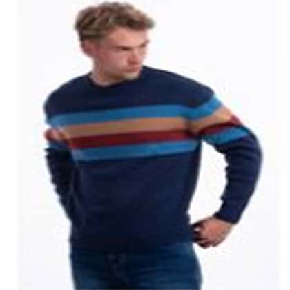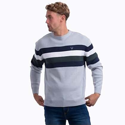 Stay smart and comfortable with this acrylic jumper in light grey colour, designed for everyday wear with a touch of charm. Crafted from soft and lightweight acrylic material, offering warmth and durability. The breathable material ensures comfort, making it suitable for everyday wear throughout the day. The stunning crew neck with horizontal stripes adds classy appeal, making it ideal for any outfit. This contrast of black, green, and blue stripes on the jumper makes it visually appealing, suitable for layering, whether it's for formal or semi-formal events.