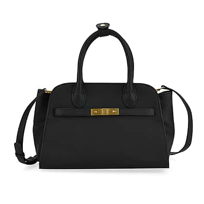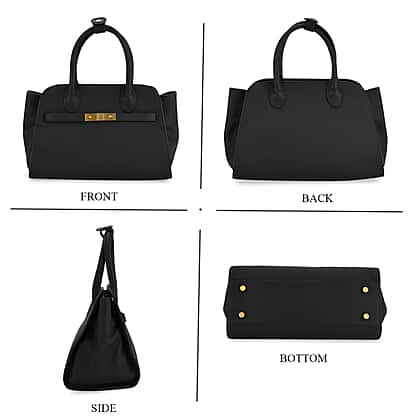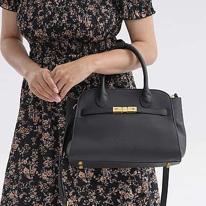 Beautifully crafted in solid black, this genuine leather structured handbag is the perfect mix of sophistication and practicality. Designed with a sleek silhouette, it features a smooth gold clasp on the front and sturdy top handles for easy carrying. The detachable shoulder strap adds hands-free convenience, while the spacious interior with zip and slide pockets keeps your essentials neatly organised. Finished with a soft polyester lining and a secure top zip, this handbag transitions effortlessly from work to weekends.