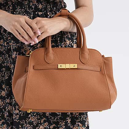 Beautifully crafted in rich brown, this genuine leather structured handbag is the perfect mix of sophistication and practicality. Designed with a sleek silhouette, it features a smooth gold clasp on the front and sturdy top handles for easy carrying. The detachable shoulder strap adds hands-free convenience, while the spacious interior with zip and slide pockets keeps your essentials neatly organised. Finished with a soft polyester lining and a secure top zip, this handbag transitions effortlessly from work to weekends.