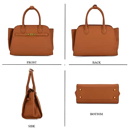 Genuine Leather Structured Top Handle Handbag with Gold Clasp & Shoulder Strap - Brown