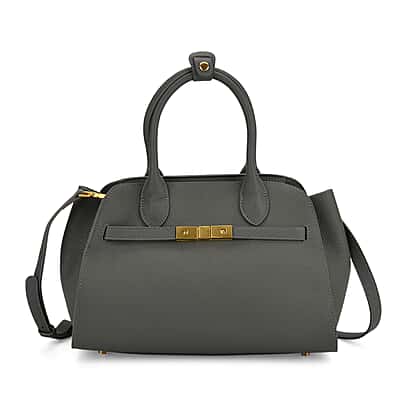 Beautifully crafted in rich green, this genuine leather structured handbag is the perfect mix of sophistication and practicality. Designed with a sleek silhouette, it features a smooth gold clasp on the front and sturdy top handles for easy carrying. The detachable shoulder strap adds hands-free convenience, while the spacious interior with zip and slide pockets keeps your essentials neatly organised. Finished with a soft polyester lining and a secure top zip, this handbag transitions effortlessly from work to weekends.