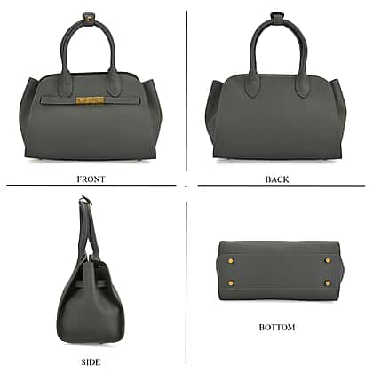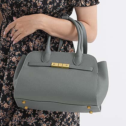 Genuine Leather Structured Top Handle Handbag with Gold Clasp & Shoulder Strap - Green