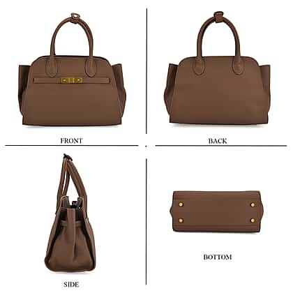 Genuine Leather Structured Top Handle Handbag with Gold Clasp & Shoulder Strap - Khaki
