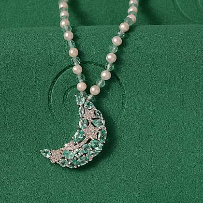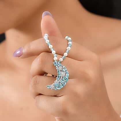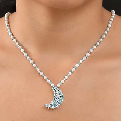 GP Celestial Dream Collection - Blue Apatite, Fresh Water Pearl, and White Zircon Crescent Moon Necklace (Size - 20) with Lobster Clasp in Rhodium Overlay Sterling Silver 20.68 Ct.