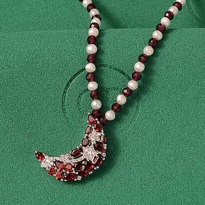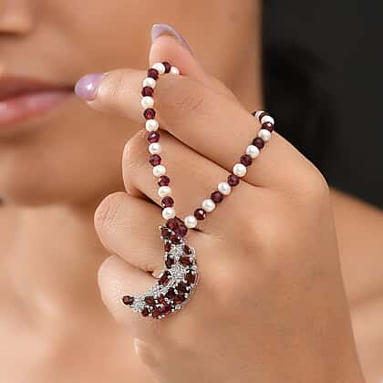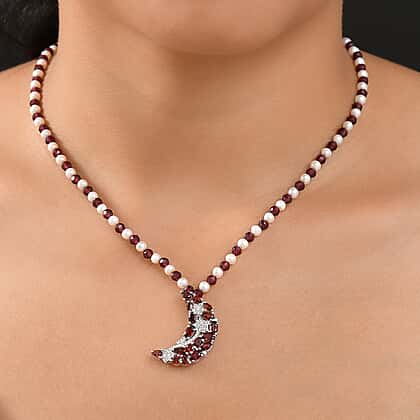GP Celestial Dream Collection - Red Garnet, Fresh Water Pearl and White Zircon Crescent Moon Necklace (Size - 20) with Lobster Clasp in Rhodium Overlay Sterling Silver 25.38 Ct.