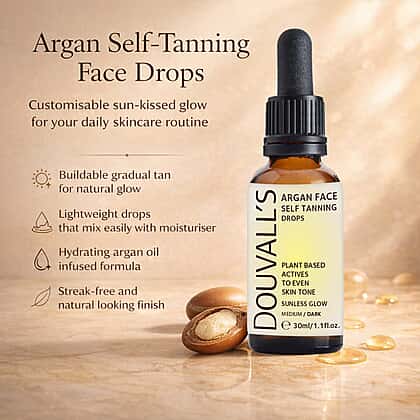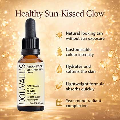 Get a gorgeous sun-kissed look with Douvalls Argan Body Self Tanning Spray in Medium-Dark. This semi-permanent tanning mist is enriched with organic argan oil to nourish and hydrate while developing a flawless bronze glow. Designed for even coverage, it’s lightweight, fast-drying, and easy to apply without streaks. The natural formulation is gentle on sensitive skin and gradually deepens over time for a radiant finish. Perfect for topping up your tan or building gradual colour, the compact 60ml bottle is ideal for on-the-go touch-ups and travel-friendly tanning routines.
