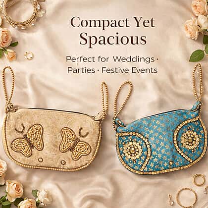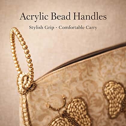 Add a touch of elegance to your accessories collection with this embroidery cosmetic and toiletry Bag, beautifully handcrafted from durable brocade material. Adorned with intricate embellishments and acrylic bead handles, these bags provide a sophisticated charm while offering practical storage for essentials like mobile phones, keys, and cosmetics. The snap button closure ensures secure storage, shaping the bag into a stylish fortune cookie shape when fastened. Compact yet spacious, this beautifully handcrafted bag is a perfect addition to your accessory collection.