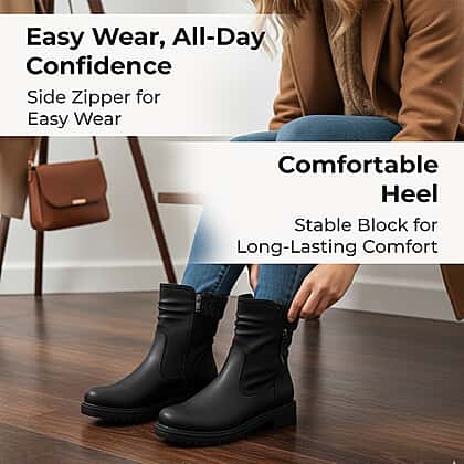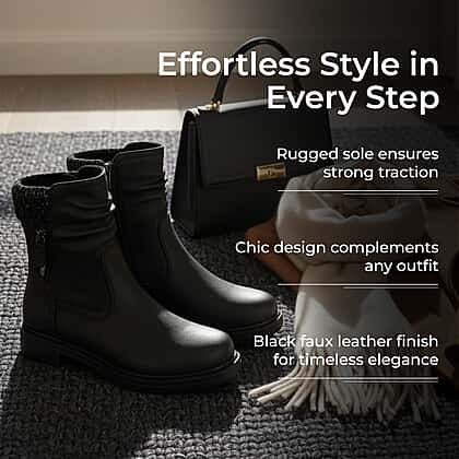 Step out in comfort with these Emma ladies' shoes in classic black, perfect boots to enhance your fashion game. Meticulously crafted with premium and sturdy materials, the shoes ensure durability and classy appeal. The design features a mid-calf rise with faux leather exterior in black, bringing sophistication and style to your look. This shoe features a zip closure, ensuring easy wear, and the sole offers excellent traction, offering all-day stability. These boots are perfect for winter and can be paired with any jeans, leggings, winter dress, or skirts, making them a must-have product for your wardrobe collection.