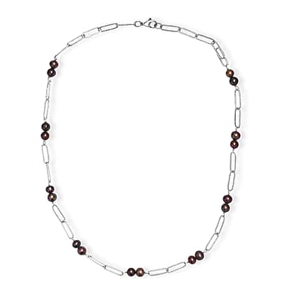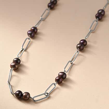 Bring vibrant charm to your outfit with this stunning chocolate pearl necklace, a perfect fusion of artistry and beauty. The necklace is crafted with a paperclip design chain, offering a classy and captivating look. The design is complemented by the beauty of chocolate-toned pearls, offering a sophisticated look. Expertly crafted in pure stainless steel, this necklace provides durability and shine. The metal has hypoallergenic properties, making it suitable for sensitive skin. The elongated link design captures attention and can uplift any ensemble.