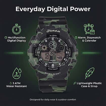 Go bold in stealth with the GENOA TIME V2 in Camouflage Black. Designed for those who value precision and style, this model features double electronic movement and an LED-backlit dial. Its deep camo tones blend seamlessly into any wardrobe. A hardwearing TPU strap and stainless steel details boost its tough profile. The watch handles water exposure with 3ATM resistance, while the stopwatch, alarm, and calendar functions keep you prepared at all times. Perfect for adventurers who prefer a sleek, understated look.