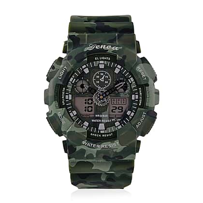 GENOA TIME V2 Double Electronic Movement 3ATM Water Resistant Camouflage Green Multifunctional LED Dial Watch with TPU Strap