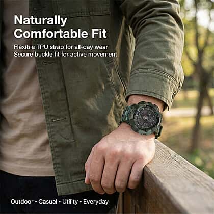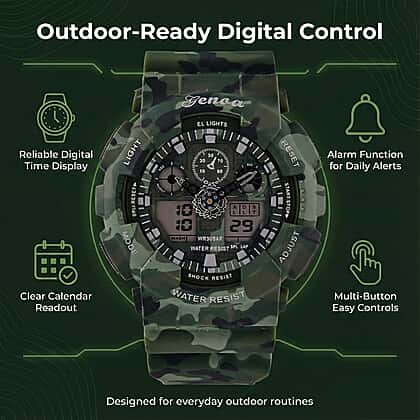 Channel the outdoors with the GENOA TIME V2 in Camouflage Green. With a design inspired by nature and built for performance, this watch pairs double movement tech with rugged build quality. The green camouflage across the dial, strap, and case evokes tactical strength, while LED features enhance readability. Crafted with TPU and stainless steel, it’s made for resilience and comfort. With alarm, calendar, and stopwatch functions and 3ATM water resistance, it keeps pace wherever your journey leads.