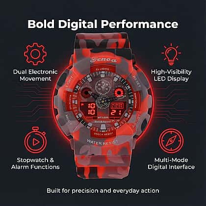 Fuel your drive with the GENOA TIME V2 in Camouflage Red. Designed for action and impact, this watch delivers reliability with dual electronic movement and a Japanese battery. The vibrant red camo adds energy, while the LED multifunctional dial enhances clarity. Its tough plastic case and flexible TPU strap handle daily wear with ease. Stainless steel elements add strength and polish. With 3ATM water resistance and features like alarm, stopwatch, and night light, it’s made for those who thrive on motion and style.