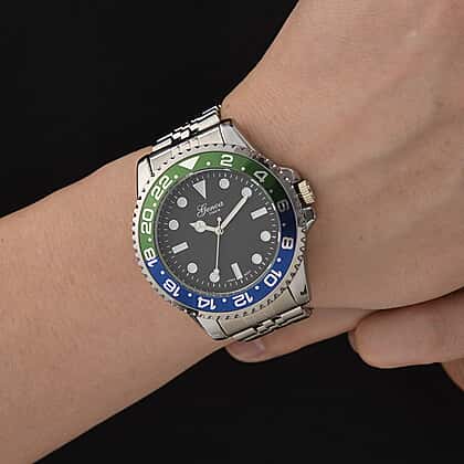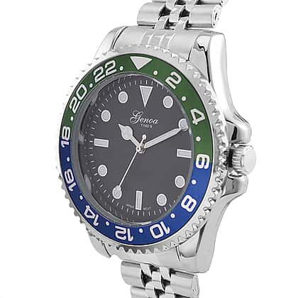 GENOA TIME V2 Miyota 2035 Japan Movt. 3ATM Water Resistant Black Dial Mens Watch with Silver Colour Stainless Steel Strap and Green-Blue Bezel