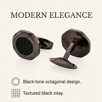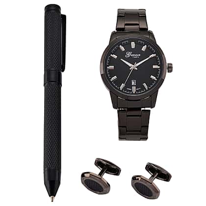 Designed to make a polished impression, this black men’s gift set of three brings together everyday sophistication and functional style. It is perfect for both corporate gifting and celebrating personal milestones. It features GENOA TIME V2 wristwatch, crafted with an alloy case and finished in sleek PNP plating. Powered by a reliable PC32 Japanese movement, it features a date function, a hydraulic dial with clear numeric markers, and durable mineral glass. The stainless steel strap and buckle add a sharp, contemporary edge, while 3ATM water resistance ensures everyday practicality. Completing the set are matching cuff buttons and a coordinated metal pen.Together, they create a statement of confidence, professionalism, and timeless appeal.