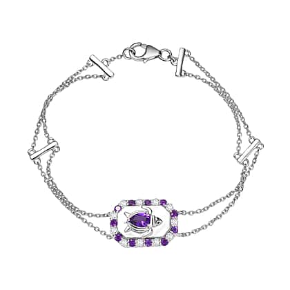 GP Italian Garden Collection - African Amethyst, White Zircon Adjustable Chain Turtle Motif Bracelet (Size 8) with Lobster Clasp in Rhodium Overlay Sterling Silver 1.23 Ct.