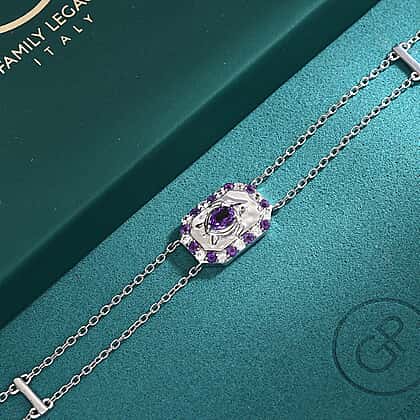 Add a splash of serenity and symbolism to your jewellery box with this African amethyst turtle motif bracelet from the GP Italian Garden Collection. Set in hypoallergenic, tarnish-resistant rhodium overlay 925 sterling silver, it’s perfect for sensitive skin and promises lasting brilliance. The turtle, a timeless symbol of wisdom and longevity, is adorned with a rich, rare African amethyst—beloved for its vibrant violet hue and scratch-resistant strength—surrounded by a halo of fiery white zircons. A double chain with sleek T-bar details enhances its delicate charm, while the adjustable 8-inch lobster clasp offers a tailored fit. Crafted with love and purpose, it’s uniquely meaningful.