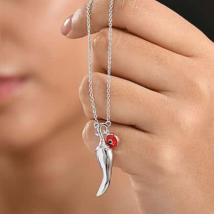 Add a bold and meaningful accent to your jewellery collection with the GP Chilli Pepper Collection necklace, showcasing a sleek silver chilli charm alongside a red evil eye disc. Known to symbolise protection, strength, and positivity, this striking design carries both beauty and sentiment. Crafted in sterling silver with a rhodium overlay, it offers a tarnish-resistant, hypoallergenic finish that’s gentle on sensitive skin and won’t turn green. Designed with a secure lobster clasp and a 20-inch chain, this versatile piece is ideal for everyday wear or layering with other necklaces for a chic, contemporary look.