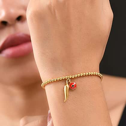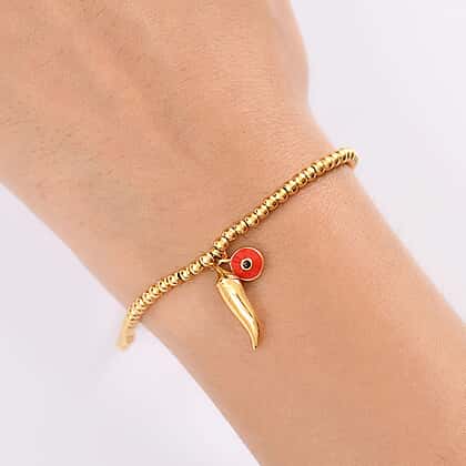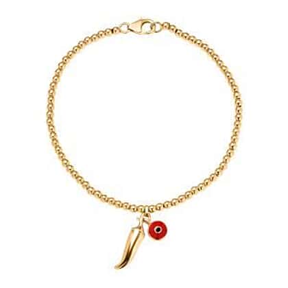Bring a spark of fun and symbolism to your wrist with the plain chilli charm bracelet from the GP Chilli Pepper Collection that represents protection and positive energy. Set on a strand of polished golden beads, this design is paired with an enamel evil eye charm to enhance its unique character. Finished with a secure lobster clasp, the size 8 bracelet is designed for everyday comfort. Crafted in hypoallergenic sterling silver plated with 18K vermeil yellow gold, it’s resistant to tarnish and safe for sensitive skin, making it a meaningful piece that’s as durable as it is stylish.