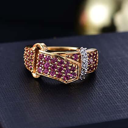 Steeped in vintage glamour, the rhodolite garnet buckle ring by the GP Royal Art Deco Collection evokes timeless sophistication. Its bold buckle design is studded with rich red rhodolite garnets, gemstones admired for their deep colour and enduring strength. Sparkling white zircons bring a diamond-like brilliance, adding fire and elegance to the statement silhouette. Crafted in 18K vermeil yellow gold plated sterling silver, the band is hypoallergenic, tarnish-resistant, and comfortable on sensitive skin. This piece captures the allure of Art Deco artistry while symbolising strength, individuality, and refined taste—an heirloom-worthy jewel designed to stand out for generations.