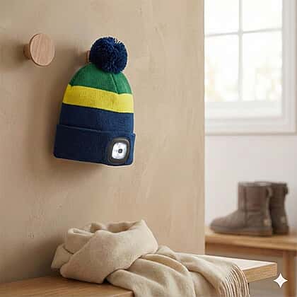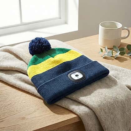 Equal parts practical and style-savvy, this striped bobble hat with USB LED makes for a cool cold-weather accessory. The cap features cosy knit stripes in navy blue, green, and yellow winter-ready tones and finished with a playful pom-pom. The cap delivers instant warmth while keeping your look effortlessly on-trend. The clever twist lies in its built-in rechargeable LED light, discreetly placed at the front. This can transform this snug beanie into a hands-free headlamp in seconds. Perfect for evening dog walks, camping trips or late-night city strolls, it blends fashion with function seamlessly. Whether worn for warmth or illumination, it’s a modern essential that works hard while looking cool.