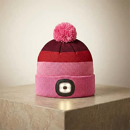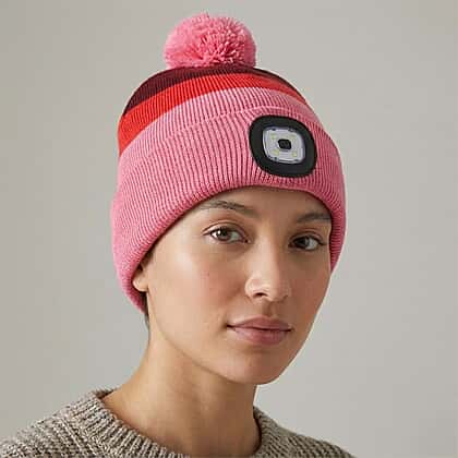 Equal parts practical and style-savvy, this striped bobble hat with USB LED makes for a cool cold-weather accessory. The cap features cosy knit stripes in pink, red, and burgundy winter-ready tones and finished with a playful pom-pom. The cap delivers instant warmth while keeping your look effortlessly on-trend. The clever twist lies in its built-in rechargeable LED light, discreetly placed at the front. This can transform this snug beanie into a hands-free headlamp in seconds. Perfect for evening dog walks, camping trips or late-night city strolls, it blends fashion with function seamlessly. Whether worn for warmth or illumination, it’s a modern essential that works hard while looking cool.