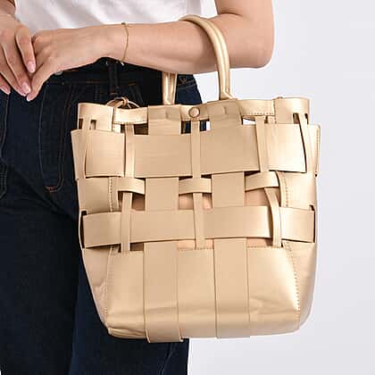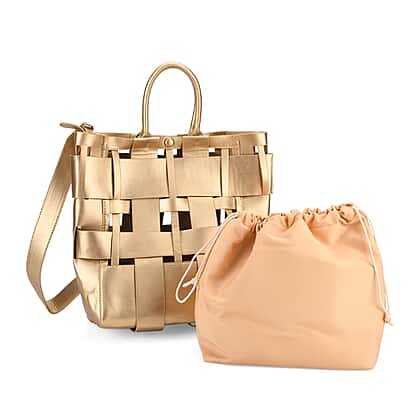 Hollow Woven Design Bucket Bag with Removable Drawstring Pouch - Gold
